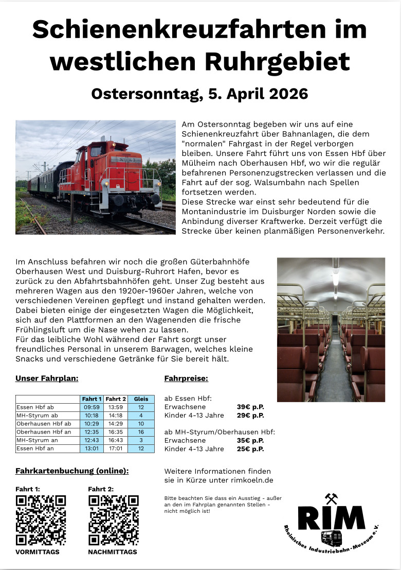 Ostersonntag 05. April 2026 - Schienenkreuzfahrten im westlichen Ruhrgebiet